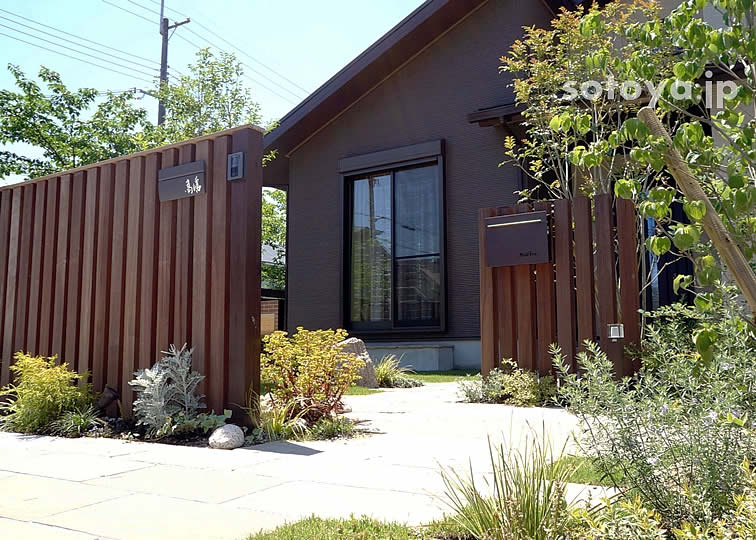 住宅地の為、見えすぎず、隠しすぎず、ほどよいバランスで目隠しを兼ねたウッド門柱