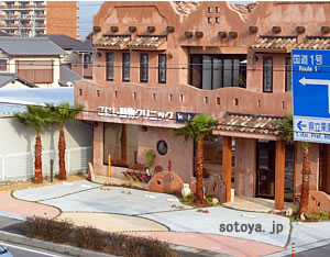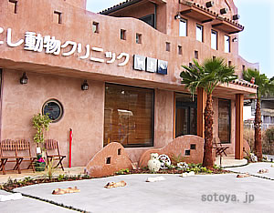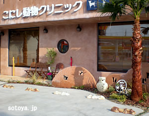 建物のカラーやヤシの木など、南国を感じさせるこにし動物クリニックさん。