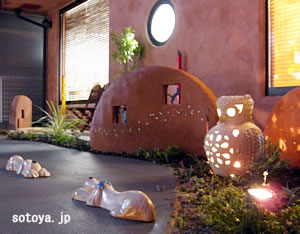 ヤシの木や壁に散らした月のかけら、埋め込んだアニマルスクリーンのシルエットなどが 暗闇に浮かび上がります。