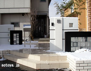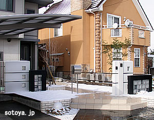門柱は前後2重に、途中にはポストやシンボルツリーが食い込むように配置し、奥行きが感じられるようになっています。
