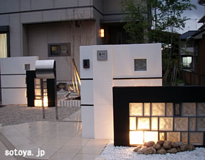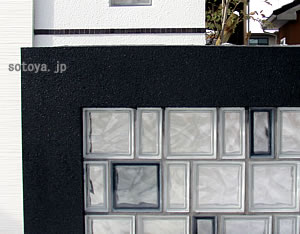 手前の黒い壁は大きさと色に変化を持たせたガラスブロックを一面に組み込んでいます。