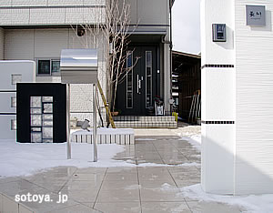 郵便ポストはマックスノブロック社の”vegas-4”をスタンドで設置。直線が多い中で唯一曲面のデザインで柔らかさを演出。