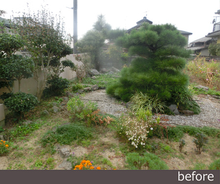 広くて手入れに困っておられたお庭。植栽スペースを3つの島にまとめ、残りは防草シートと砂利敷きにし、お手入れがしやすいようにしました。眺めてもよし、歩いてもよし。日常が楽しくなるようなお庭ができました。