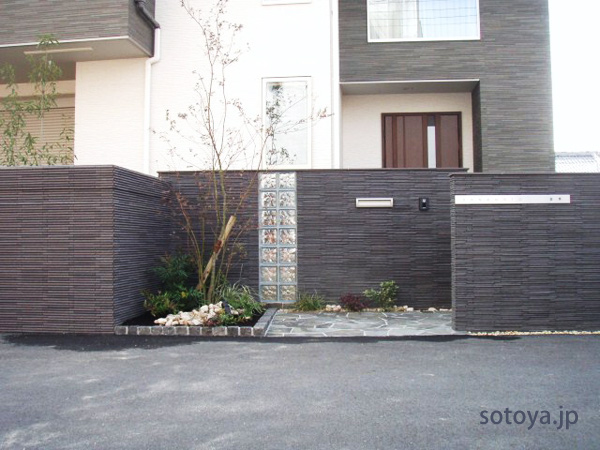 建物とのバランスを考え、エクステリアは黒で統一しました。単調にならないように、違う素材を組合せ、また凹凸をつけました。ガラスブロックや小物使いで、スタイリッシュな印象になるようにしています。
