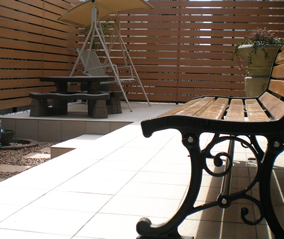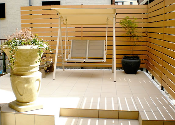 視線を遮る背の高い目隠しフェンスは圧迫感の無いようにナチュラルカラーを選びました。天然木ではなく、木彫パネルでメンテナンスフリー。タイルとともに経年劣化が少なくランニングコストがかからない素材を使用。タイルの白と木彫パネルの自然なカラーが上質な印象を与えてくれます。