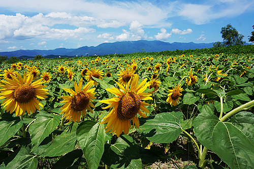 琵琶湖と比良山脈をバックに一面のひまわり畑
