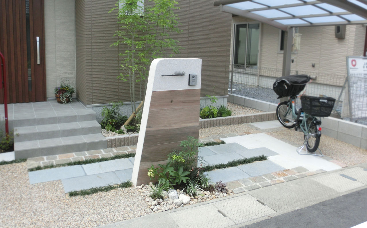 2種類の石を使い、アプローチを充実させて、門柱のシンプルなイメージとバランスを取りました
