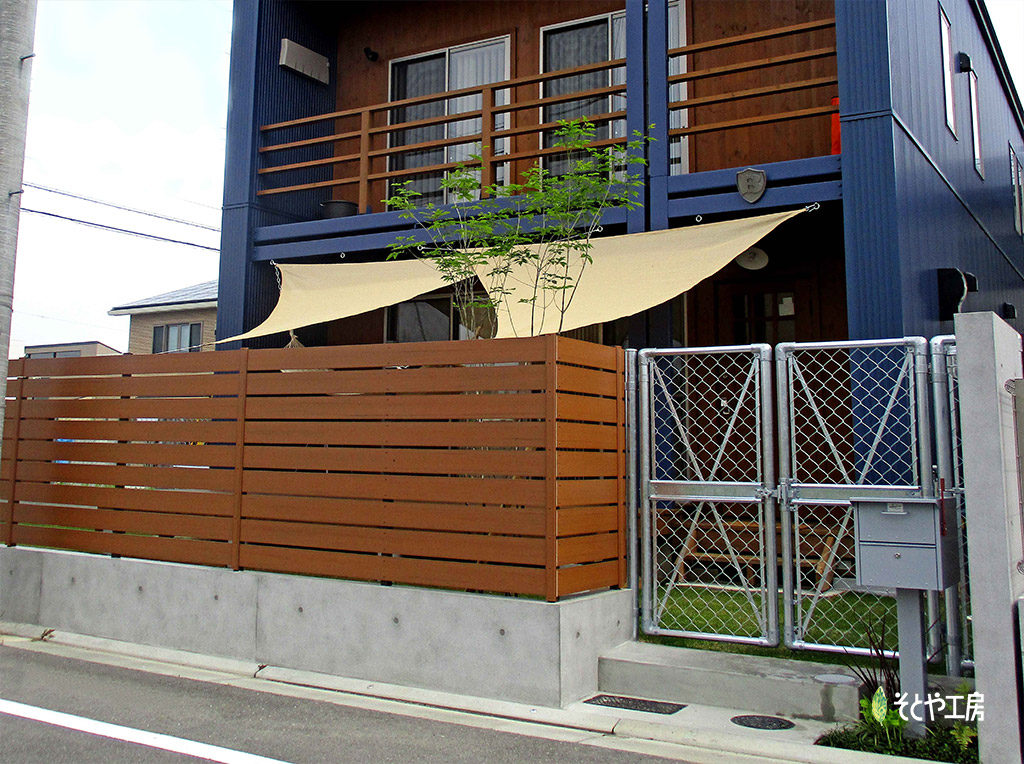 木目のフェンスは、建物で使用している色と近づけることで統一感を持たせました。