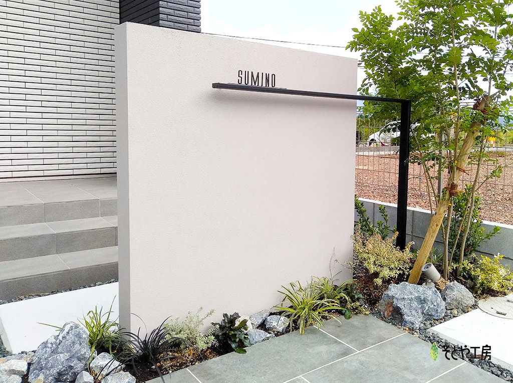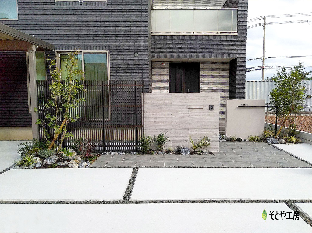 オープン外構でありながら、縦格子と門柱で適度な目かくしをすることで、建物をグレードアップさせることができます。