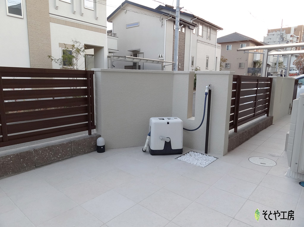砂利敷だった生垣の内側のお庭スペースにはタイルテラスを設置し、