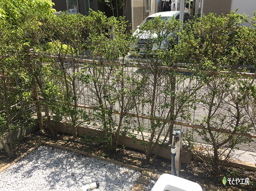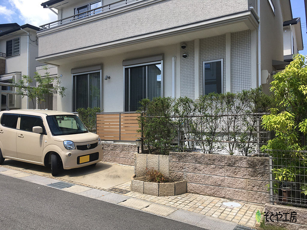 ということで塗り壁と木調フェンスの組み合わせで、メンテナンスフリーの外構へ一新しました。