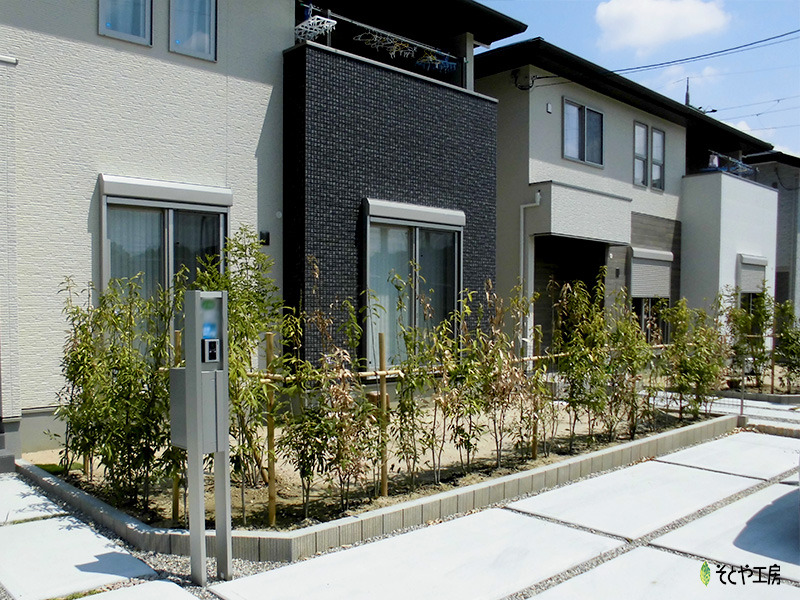 一部植栽を残し、樹脂製フェンスを設置。植栽スペースはレンガで区切り、人工芝を敷き、すっきりメンテナンスフリーのお庭に生まれ変わりました。