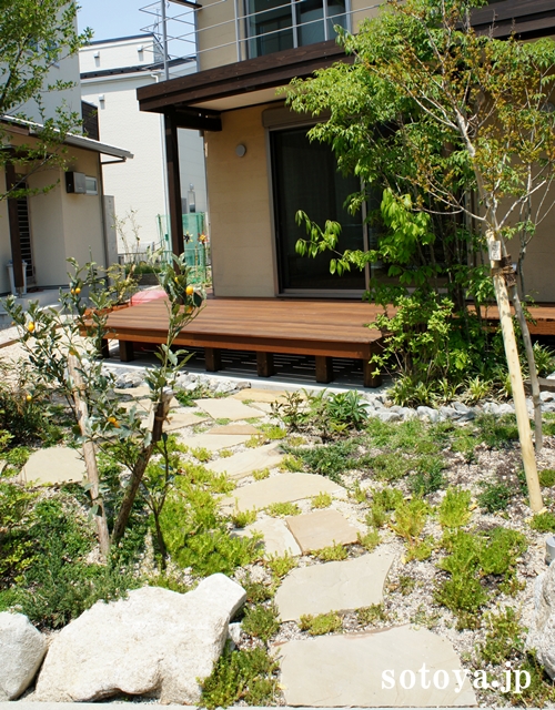 石と石の間にはセダムやグランドカバーを植えて、緑あふれるお庭に。