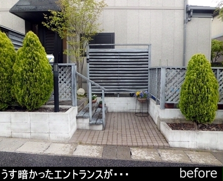 手入れが必要だった以前の木製フェンスを木調アルミ素材のフェンスに変更。オープン外構から、門扉を設置しクローズ外構に変身!素材をシンプルに揃え、既存の生垣や樹木も剪定したので、閉塞感ではなくスッキリとした印象になりました。