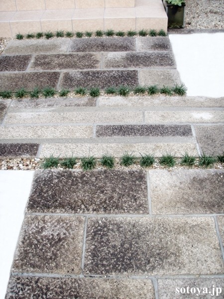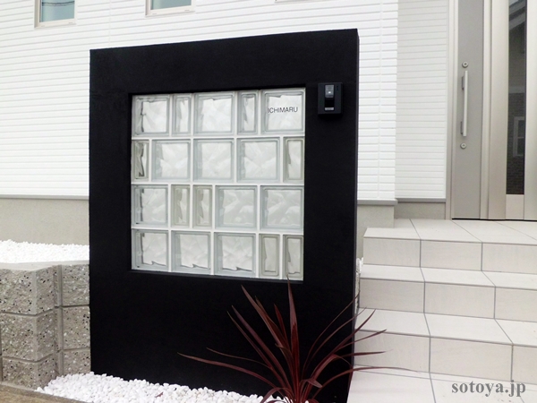まっしろな建物に対して黒い門柱でアクセント。ガラスブロックのサイズに変化をつけて単調にならないようにしています。