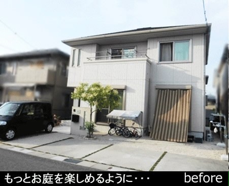 子供の遊び場と、家族で過ごせるお庭がご要望でした。テーブルやイスを置けるくらいの広々としたタイルテラスと、紫外線カットのテラス屋根、そして目隠しと、お庭で楽しむ準備は万端です。