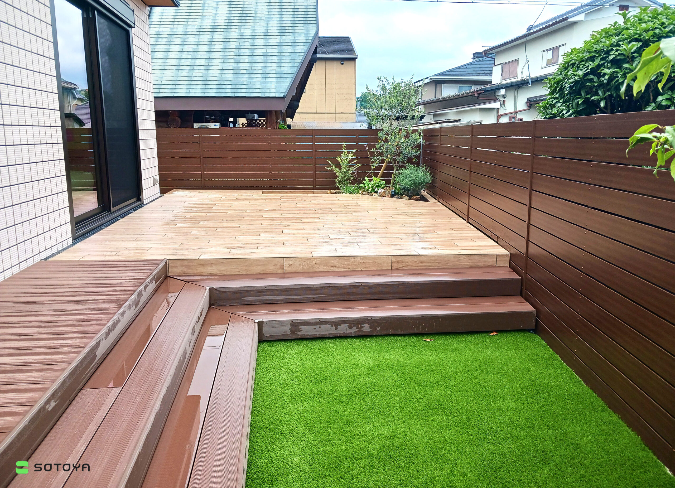 タイルテラスを木調にしフローリングの目地と合わせることでつながりを感じさせることができます。 お孫さんと楽しく安全に過ごせるよう片側は樹脂デッキと人工芝にしました