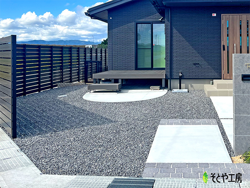 目隠しフェンスと同じ素材・高さの片開門扉を設けることで、外側から見ても一体感のあるスタイリッシュな外観となりました。
