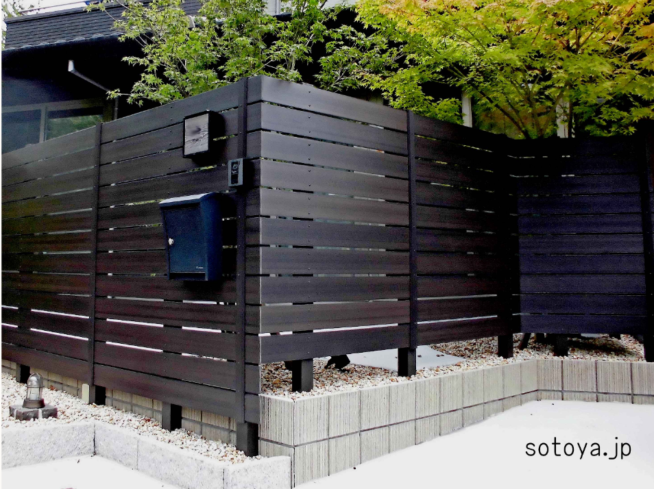 門柱の役割を兼ねたハイブリッドな目かくしフェンス。 今回採用したのは木目調タイプの樹脂製素材。 高さや、板と板のすき間も自由に決定できる優れもの。 柱はアルミ材なので、強度もバッチリです。