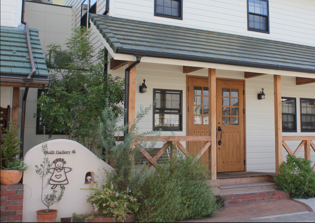キルトギャラリーを営まれている店舗のエントランス 店内の雰囲気に合わせてナチュラルなアメリカンカントリー調に。 アイアンで作成した店名ロゴと、オリーブがシンボルの可愛いお庭です。