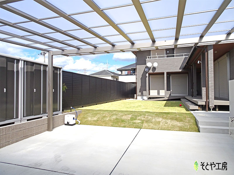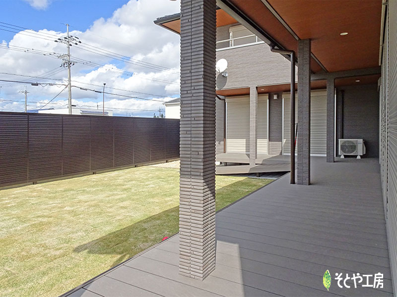 広々とした芝庭ではワンちゃんも一緒に遊んで過ごす予定。 ウッドデッキにはスロープも付け、ワンちゃん用のアプローチも準備万端です。 ウッドデッキといえば茶色をイメージしがちですが、今回のデッキはLIXILの樹ら楽ステージの新色:グレーウッドです。
