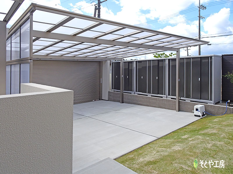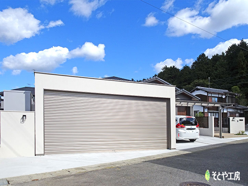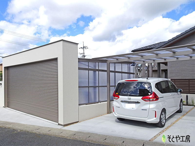LIXILのワイドシャッターS Cタイプを設置したカースペースです。 車を雨風から守るだけでなく、いたずらや盗難からも守ります。 ガレージ内には目隠し代わりに物置を設置。 カー用品の収納など、近くにあると便利な物をサッとしまえる動線です。