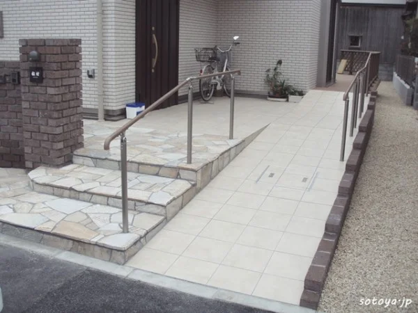階段は滑りにくい石材を使い、色味でアクセント。 奥のウッドデッキまで続くスロープはポーチと同じタイルで一体感を出しています。表札もフレーム&タイル表札を選びました。