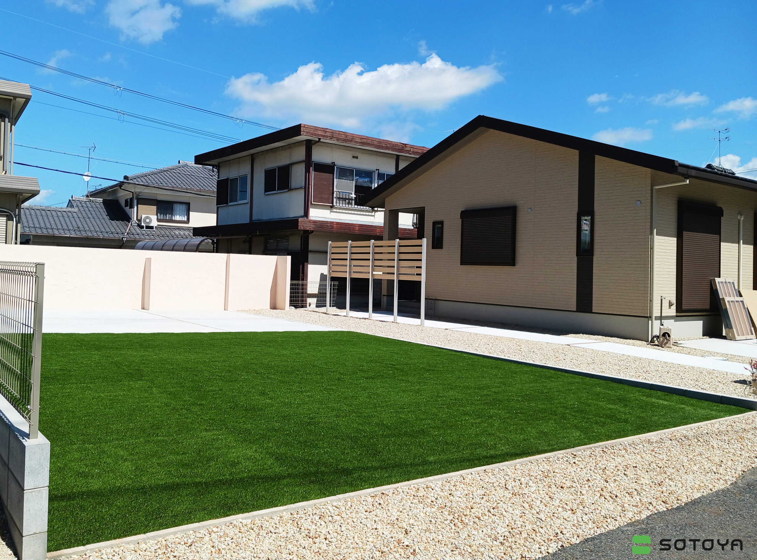 更地だったお庭をコンクリートと人工芝に。バスケットやプールなど存分に楽しんでいただけます。塀も明るく塗装することでお家の雰囲気に合わせた空間に仕上げました。