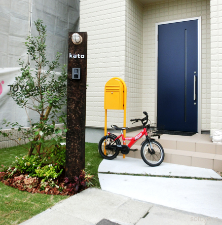 ポップな色がお好きなお施主様。黄色のポストに枕木、シンプルな切文字表札を合わせて、ナチュラルながらもシンプルでおしゃれな門まわりに。