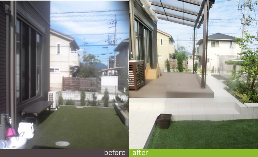 もっと有効的に利用したいとのご相談を頂き、一番はお部屋からと玄関からの動線を意識。全体的にお部屋前は高さを上げて出やすくなり、さらに植栽の緑もお部屋から楽しめます。夏には、BBQやお子様のプールに活躍してくれそうです。