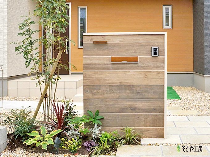 表札やポストの口金もウッド調のもので揃え、統一感のあるナチュラルなエントランスに仕上げました。