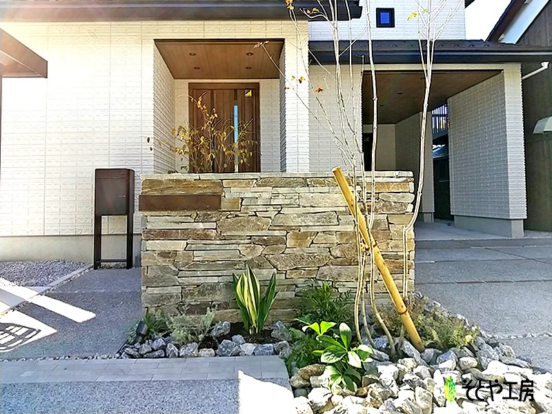 石積み職人が丁寧に積み上げた味わいある門柱。 高さを抑えながらも天然石ならではのサイズや色むらが存在感があり経年変化と共に深い味わい、和の趣を取り入れたエントランスとなります。