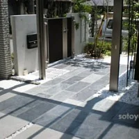 アプローチには全体を引き締める効果を出すため黒い敷石を使用。