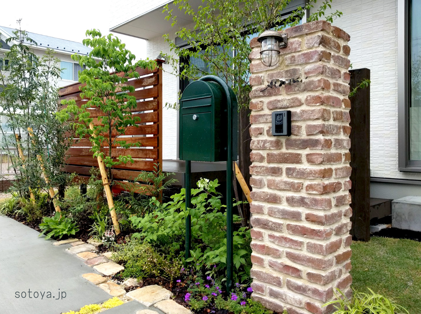 無骨なレンガに白色の目地で、ナチュラルに仕上げた門柱。