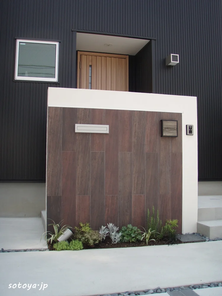 ガルバリウム鋼板のクールな建物の外壁にあえてウッドカラーの内柱でコーディネート。異質な素材の組み合わせで独特な表情となりました。