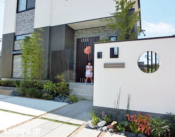 門柱の丸窓+虎竹格子がポイントの和モダンなエントランス。