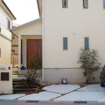 枕木のステップやシンボルツリーのシマトネリコ。 シンプルでモダンな門柱。ナチュラルさとモダンさを兼ね備えた外構です。 写真のポストは、Dポスト という商品です。