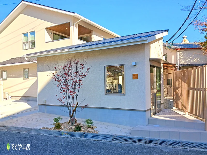 以前に本宅の外構を弊社にお任せいただいたお客様より、今回は隣りに建てられたアトリエの外構施工をご依頼いただきました。 本宅のアプローチで使用した平板を植栽周りに使用することで、全体的に統一感のあるデザインにしました。 建物の塗りと玄関前のフェンスの色味がよく合っていて、まとまりのある素敵な外構で