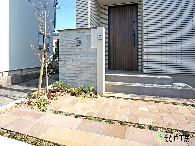 天然石ならではの色むらや凹凸に積み重ねてできる陰影はエントランスをシックに引き締め 色合いを明るい色にすることで植物のグリーンとの相性も良く上品な印象となります。