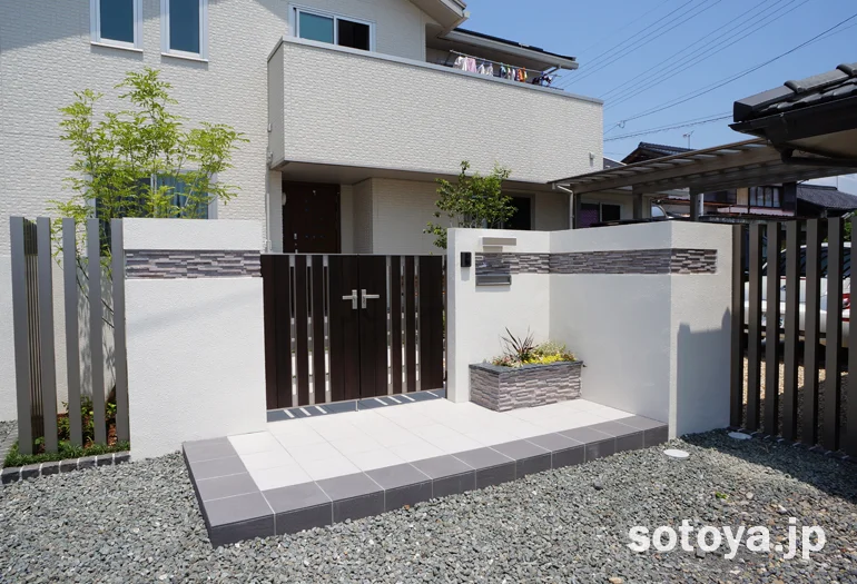 クローズ外構ですが、角柱や色みで軽やかな印象に仕上げています。