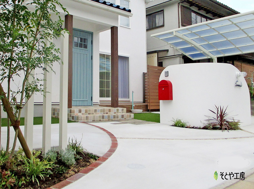 深みあるブルーの屋根に白い壁、玄関扉はスモーキングなブルー。可愛いらしく、お洒落でこだわりの詰まった新築のお家に添えるエクステリアを、とI様からご相談を頂きました。
