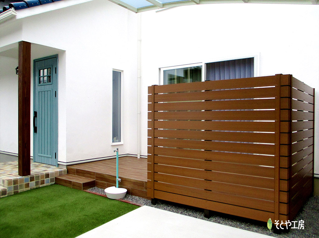 角のとれた優しい雰囲気の門柱がアクセントとなり、時に目隠しとして、時に後ろに見える人工芝を敷いたお子様の遊び場を守るような役割として。安心感のあるボリュームにデザインしました。