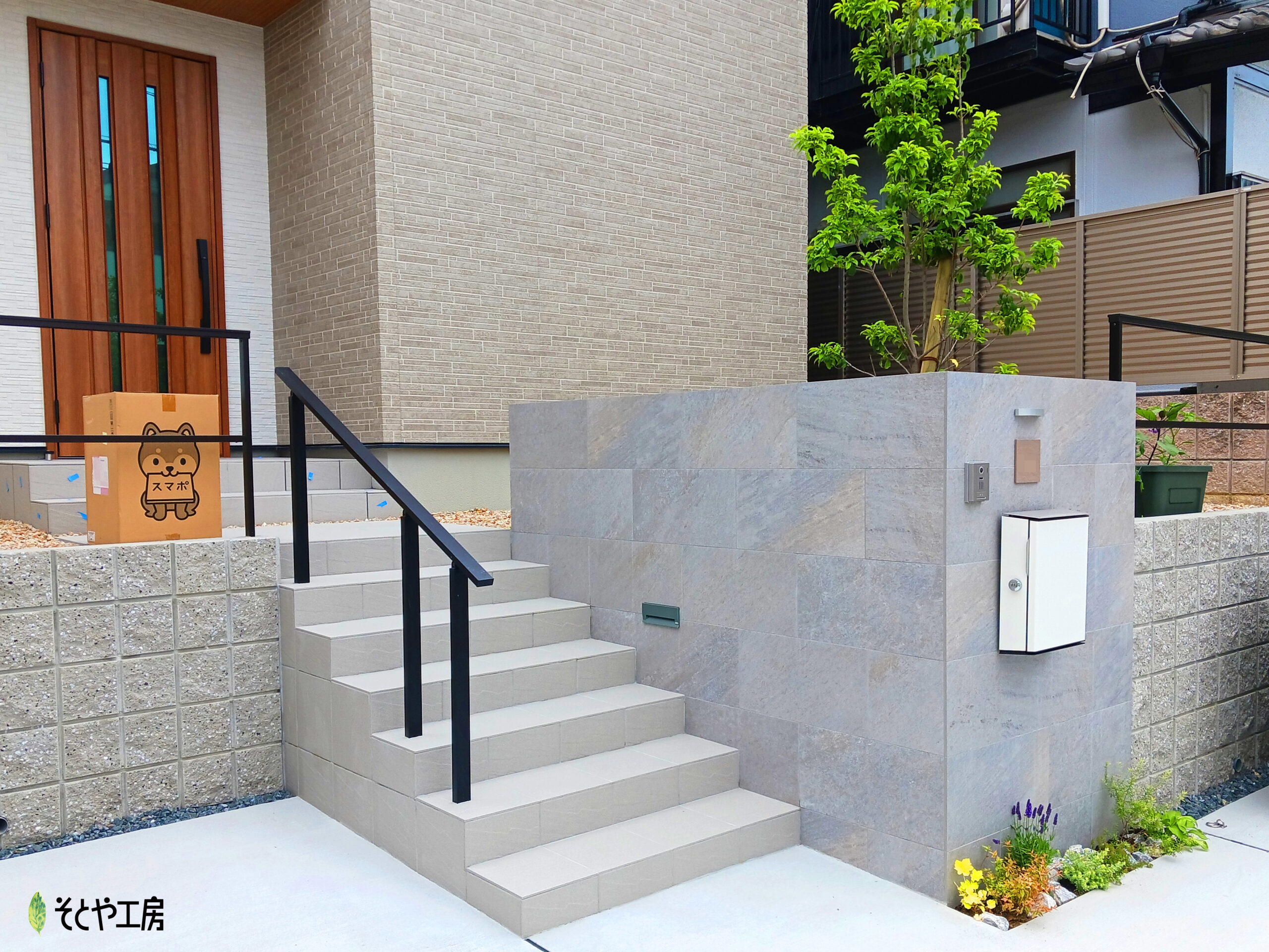 新築京阪店アプローチ門柱・エントランス塀・フェンス・目隠し照明・ライト植栽