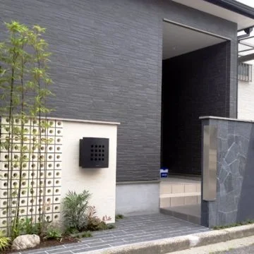 建物外壁に合わせ、左右モノトーンに配色、門柱丸窓の竹組や植栽に黒竹を植えたことで和モダンなテイストに仕上げました。シンプルだった外観が重厚な印象に!!