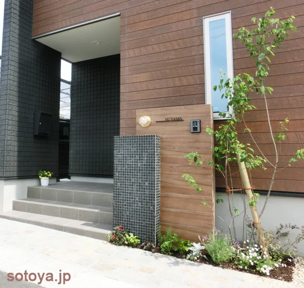 シックな黒と濃く粗い木調の建物に合うように、ヴィンテージ感のある門柱にデザインしました。2種類だけの素材でシンプルに仕上げですが、デッキライトと切り文字表札がシンプルな門柱のアクセントになっています。