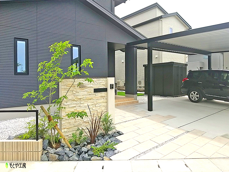 柱に光が当たり生まれる陰影、夜間はライトアップし昼と違った印象になります。 さりげなくアオダモの優しい葉の影が落ち上品なファサードです。