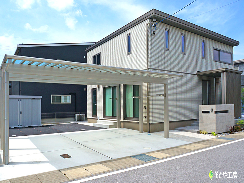 住宅に使われているタイルに対し、門柱には大判のタイルを使うことでメリハリをつけました。 また、表札部分の黒い差し色がアクセントとなり、より引き締まった印象となります。