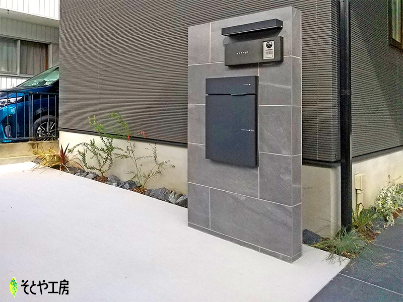 門柱はグレー色を基調として落ち着きのあるデザインに。 アプローチには600角の大判タイルを使用して高級感のあるエントランスに仕上げました。