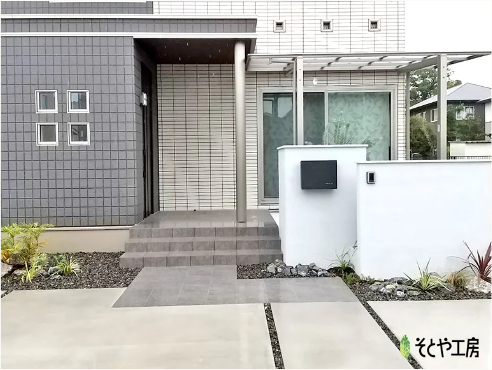 全体的にシンプルな建物、その雰囲気に合う外構にしました。 シンプルな中にも、壁を段違いにし変化をつけたり植栽と景石を彩ることで、リゾート感のある外構に仕上げました。