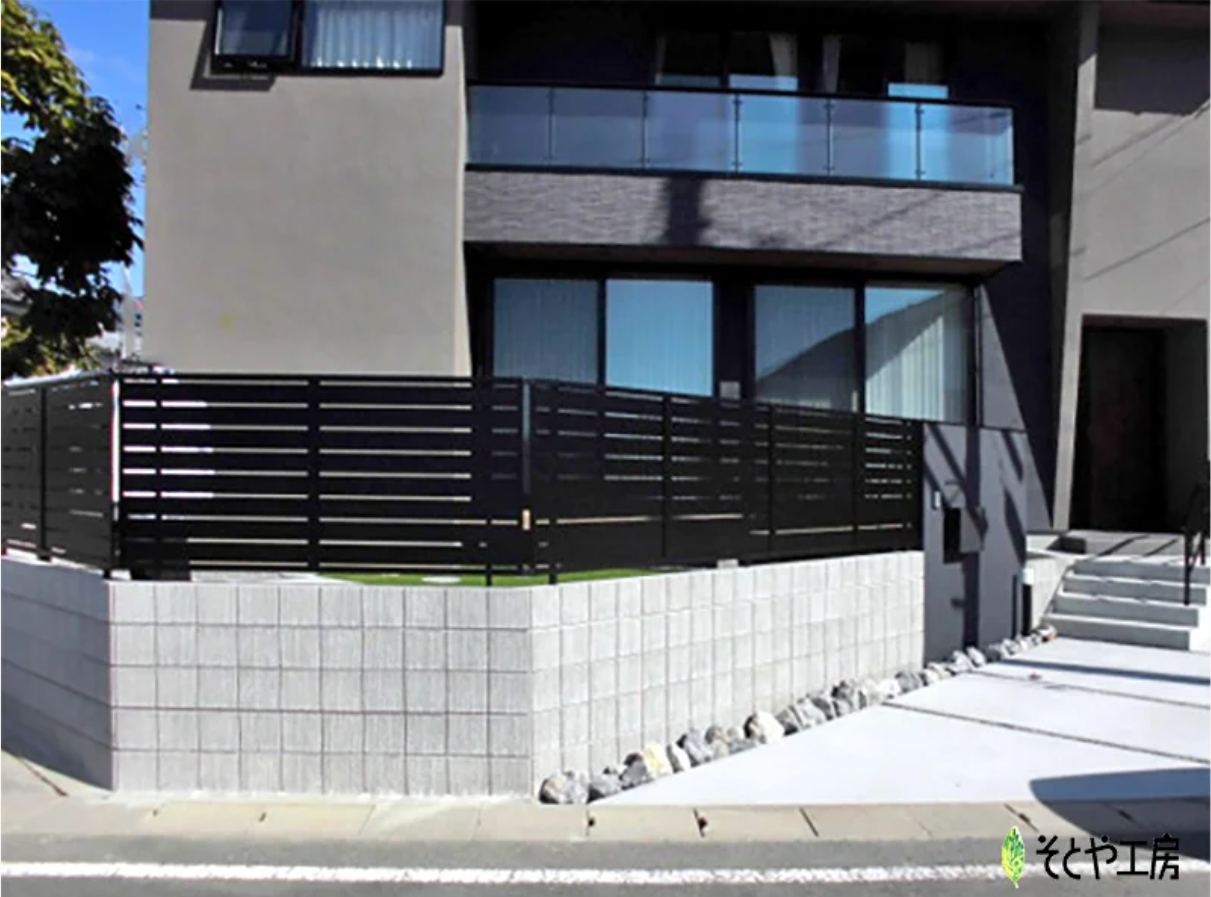 お庭とアプローチを門柱+目隠しフェンスで斜めに仕切ることで、外構の配置がより印象的になります。 グレー×ブラックのカラーバランスでスタイリッシュモダンな雰囲気で建物を引き立てています